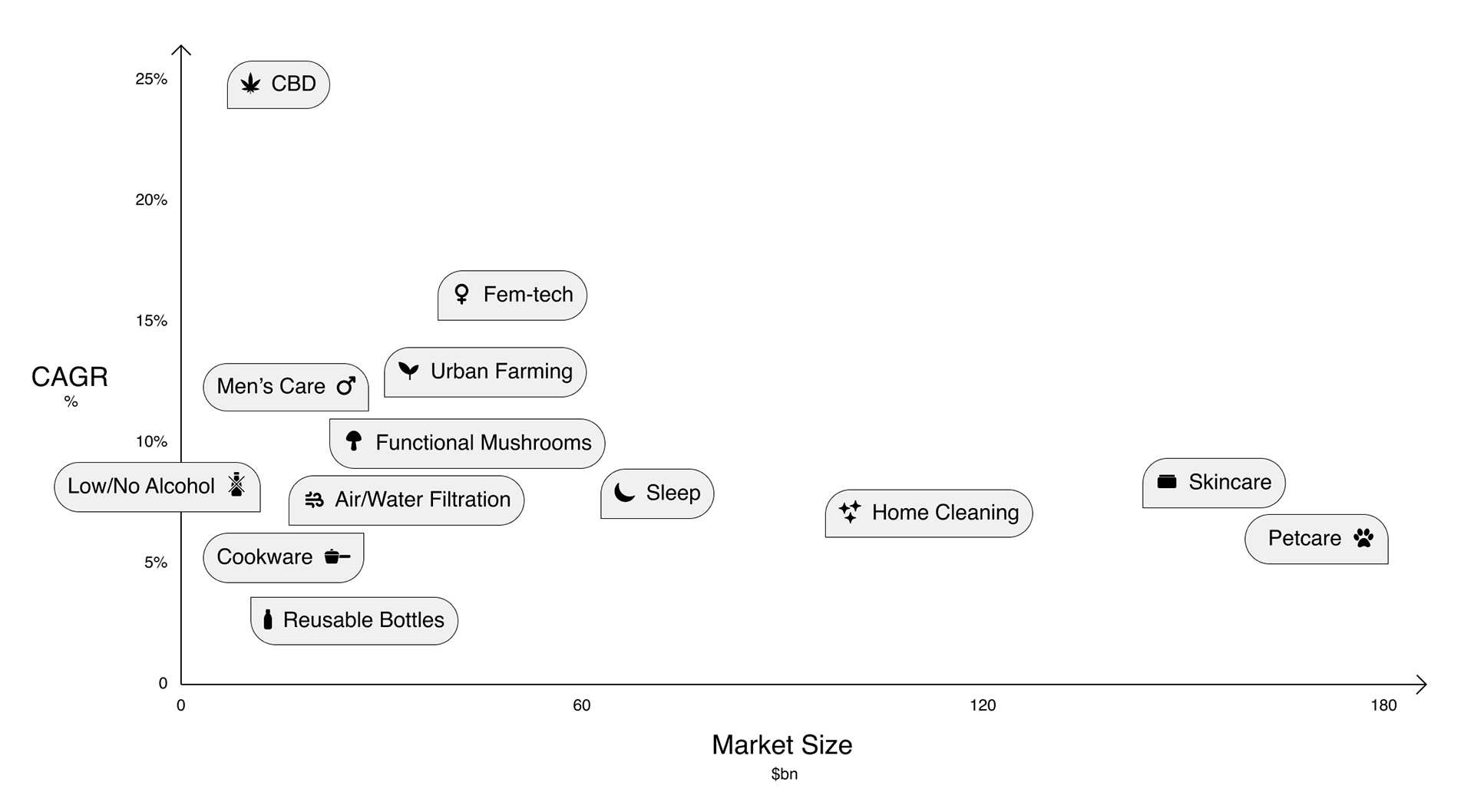 The outcome was a 130 page report exploring each macro trend in detail. The opportunity space lies in a combination of market size, CAGR and incumbent dominance - whilst satisfying all 4 business requirements. There were 2 clear winners: Petcare and Home Cleaning. Further analysis showed Petcare as the best fit.